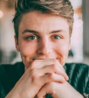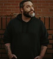 A portion of a building with the phrase 'WE CARE!' written in large, bold letters on its upper section. The building features a flat roof with railing and several windows just below the text.